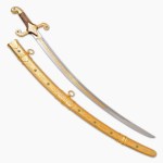 سيف عربي فاخر مصنوع من فولاذ دمشق مع مقبض خشبي، مزين بنقش ذهبي وزركونيا مكعبة.
