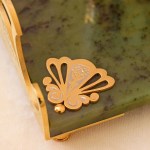 طقم هدية قهوة مصنوع من البورسلين والذهب على صينية حجرية. ملاعق الشاي متضمنة. الصينية مصنوعة من الحجر الطبيعي – اليشم.